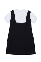 Short dress with logo and front print. Model featuring an integrated short-sleeved cotton t-shirt, characterized by a contrasting panel and an A-line silhouette.