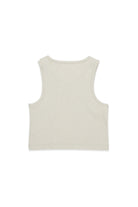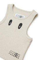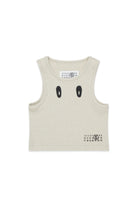 Sleeveless T-shirt with logo and contrasting front print, crafted from textured fabric with metallic yarn. The model features the iconic stitching on the back.