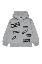 Full-zip hoodie with logo and oversized front text patch.