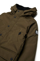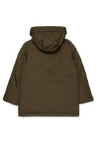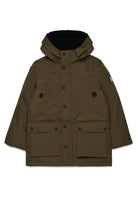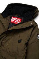Long nylon padded jacket with Diesel patch on the shoulder. Fake down padding with hood. Hidden front zip closure, four pockets on the front.