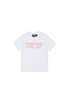 Short-sleeved T-shirt in soft cotton jersey with "Dsquared2 Loves You" rubber effect print on the front. Pop character lettering that winks at little fashion lovers.