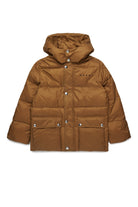Padded hooded jacket, ideal for colder days. Front button pockets and contrasting color institutional logo add distinctive details, making it a recognizable garment perfect for the winter season.