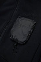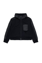 Long-sleeved hooded full zip sweatshirt made of cotton. Shiny nylon inserts and a drawstring pocket create a dynamic mix of contrasting textures for a bold urban look.