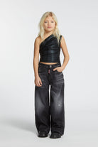 Shaded black regular fit Traveller Jean jeans with frayed breaks. It is fitted at the waist and softer from thigh to ankle with a wide bottom. A denim with a worn look to give character to any outfit.