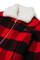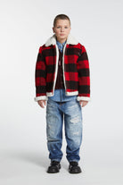 Long-sleeved shearling-type jacket in soft plaid flannel with teddy inner. A mix of comfort and character, with utility pockets and the horror-themed logo on the back.