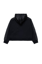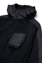 Long-sleeved hooded full zip sweatshirt made of cotton. Shiny nylon inserts and a drawstring pocket create a dynamic mix of contrasting textures for a bold urban look.