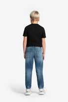 JoggJeans® D-Lucas regular fit in medium blue denim with abrasions with a casual attitude. A straight-cut design with a tapered leg that is looser at the thigh and gradually tapers toward the ankle. Can be worn at the waist or pulled down for a more relaxed look.