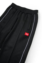 Shiny triacetate balloon pants with red D patch and contrasting piping, a fusion of comfort and sporty inspiration. The soft, structured fit is enhanced by front ribbing.