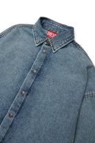 Blue marbled-effect long-sleeved oversize denim shirt. A garment that combines comfort and style, ideal for adding a touch of personality to everyday outfits.