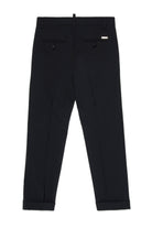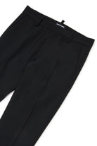 Formal chino pants in cool wool. American-style front pockets. Metallic logo plaque above one of the back pockets. A perfect garment for ceremonies and special occasions.