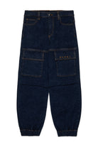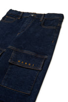 Dark marbled-effect denim cargo jeans with pockets along the leg. A model that combines practicality and style with tobacco-colored stitching that enhances the design. A garment with a clean look that is easy to match.