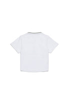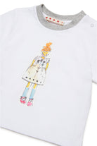 Short-sleeved jersey T-shirt. It features a print of a drawn doll on the front. Crew-neck in contrasting colour. Practical snap button closure on the shoulder. Made of 100% cotton.