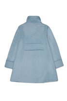 A-shape long sleeve wool-blend coat. The flared silhouette and minimal design make it a practical and refined garment, perfect for cold days. The high collar protects and adds a touch of style.