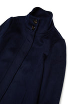 A-shape long sleeve wool-blend coat. The flared silhouette and minimal design make it a practical and refined garment, perfect for cold days. The high collar protects and adds a touch of style.