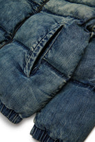 Dirty-effect denim padded jacket, a mix of character and originality. The washed denim base, enhanced by spraying, gives the garment a lived-in, contemporary aesthetic. An ideal garment to face winter with personality.