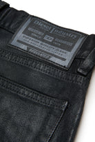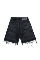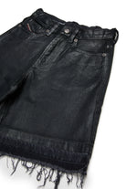 Black denim short pants with raw-cut hems. The special coating gives a special shiny effect that enhances the grunge soul of the garment.