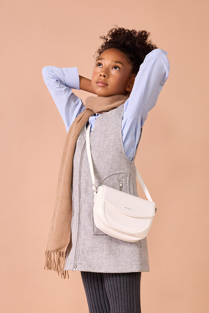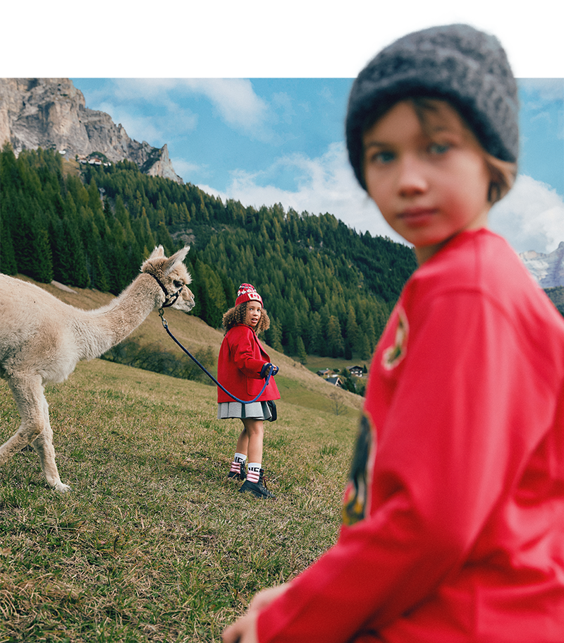At our Merry Farm, children rediscover the joy of running free, laughing together, and cuddling alpacas and donkeys, dressed in warm, natural looks full of personality.