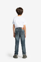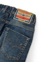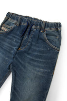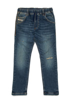 JoggJeans® Krooley regular fit dark blue denim with breaks and sporty attitude. A straight-cut design with a tapered leg that is softer at the thigh and gradually tapers toward the ankle. A vintage-look jeans with zig-zag mending typical of Diesel DNA.