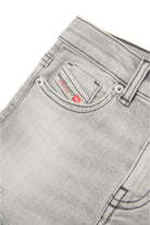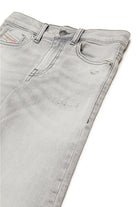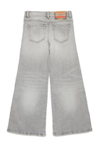 Five-pockets JoggJeans® with flare fit and disc attitude. Medium-waisted. Made of soft-handle light grey denim, distinguished by gradients and color contrasting whiskers. Abrasions and rips accented with zig-zag seams at the front. The design features an adjustable waist and elastic closure.