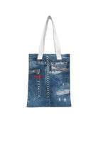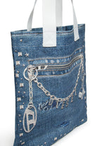 Wrisy tote bag with logo and denim-effect print, embellished with studs and chain details on the front. The design features double fabric handles and a solid-color interior.