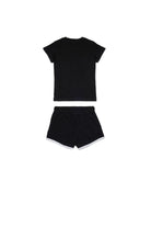 Set composed of short-sleeved crew-neck t-shirt with cursive logo on the front and cotton jersey shorts with contrasting color piping.