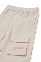 Pants with logo and applied cargo pockets. Practical model with drawstring waist, made of 100% cotton.