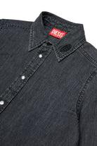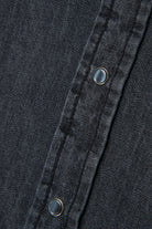 Denim shirt with applied logo on the collar, featuring snap button closure and exposed stitching.