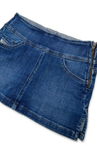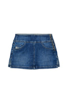 Denim mini skirt with logo. Five-pocket model with a casual design, featuring an above mid-thigh length and side zip closure.