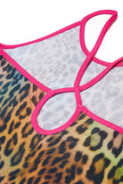 Cover-up with logo and multicolor animal print, finished with contrasting trim. The model features a mini silhouette and crossed straps on the back.