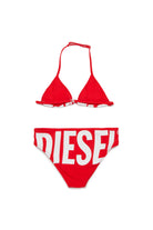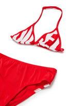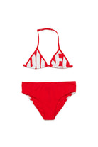 Bikini with contrasting logo and triangle design. The top features an all-over contrasting logo on the front.