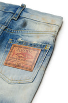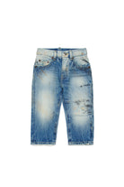 Regular jeans in light blue denim effect with distressing and used wash.
