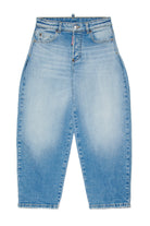Relaxed jeans in light denim, featuring a wide cut and a back pocket with a faux leather patch.