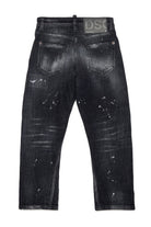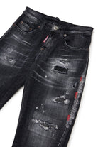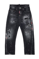Regular jeans with a black used-effect wash, featuring rips and contrasting stitching details.