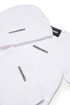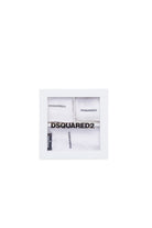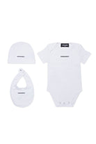 Birth set in micro ribbed knit. Consisting of a short-sleeved bodysuit, cap and bib. All items are branded with the Dsquared2 logo and made of 100% cotton. The kit comes inside a gift-box.