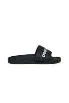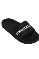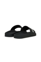 Slide sandals with contrasting logo. Featuring a single strap and flat sole.
