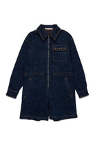 One-piece short jumpsuit in marbled denim with tobacco-colored contrasting stitching. A casual, contemporary style garment enhanced by the drawstring waist, which allows you to adjust the fit.