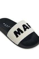 Modern design slide slippers. Terrycloth upper with maxi Marni! logo embroidered in contrasting colour. Polyurethane sole. Made in Italy.