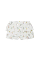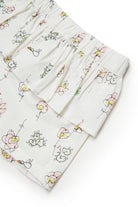 Printed shorts with ruffle trim. Perfect for adding a vibrant touch to your wardrobe.