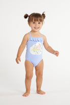 One-piece swimsuit with logo and unicorn print, ruffle detail on the neckline, and cross-back straps.