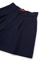 Formal-cut shorts with front pleats, featuring belt loops at the waist and a logo patch on the back.