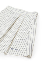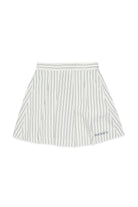 Short skirt with logo and vertical stripe pattern. The garment features an A-line silhouette and stitching details on the waistband.