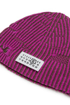 Soft and snug, two-tone ribbed wool beanie. Mending breaks give a worn effect, making this accessory a perfect element for a look that combines comfort and personality.