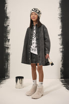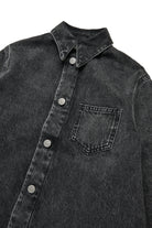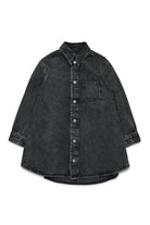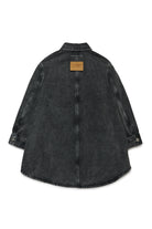 Black worn-effect denim maxi shirt dress with asymmetrical bottom. A versatile must-have that combines comfort and style, perfect for any occasion.
