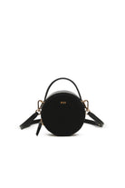 Round-shaped crossbody bag with logo, featuring an adjustable strap and gold-tone metal details.