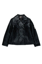 Long-sleeved double-breasted jacket in coated fabric. A contemporary blazer with a fitted silhouette at the waist, enhanced by maxi coated buttons.
