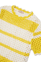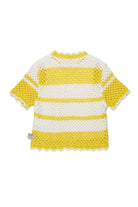 Openwork knit pullover featuring crochet workmanship and wavy trims.