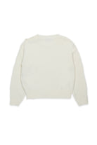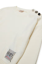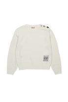A wool-blend pullover in a reverse-knit shaved knit, combining comfort and style. The three jeweled buttons on the shoulder, each one different from the other, add a touch of elegance and originality, making the garment unique and sophisticated.