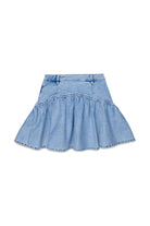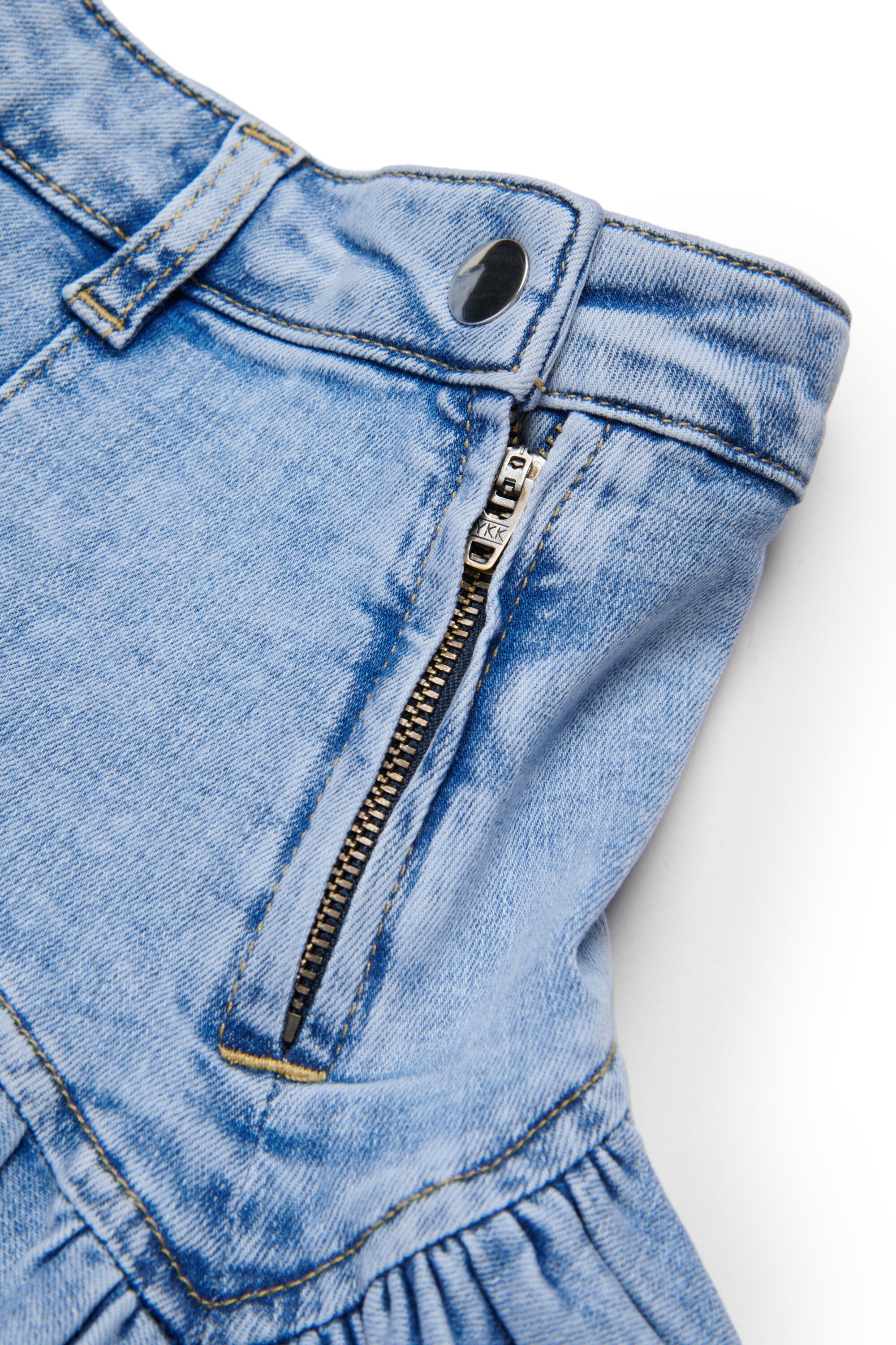 Short denim skirt with gathered flounce. A garment with a modern look thanks to exposed stitching and a flared design.