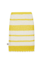 Skirt with side logo and horizontal striped crochet design. The model features a midi length and a shaped hem.