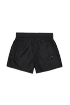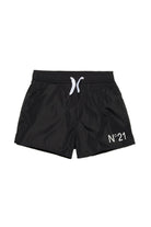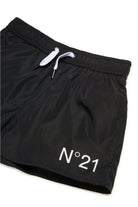 Nylon boxer swimsuit. Midi length. Drawstring waist. Contrasting color N°21 Institutional logo on front. Mesh inner briefs. Back pocket.